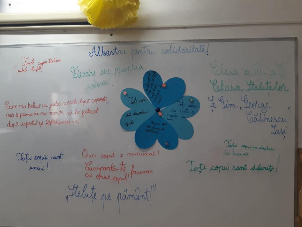 Cu ocazia „Zilei Internaționale de Conștientizare a Autismului” – 2 Aprilie, Școala Gimnazială “George Călinescu” Iași a desfășurat activități alături de Scoala Specială Pașcani în proiectul “Albastru pentru solidaritate”. S-a urmărit înțelegerea, cunoașterea și integrarea copiilor cu Autism.